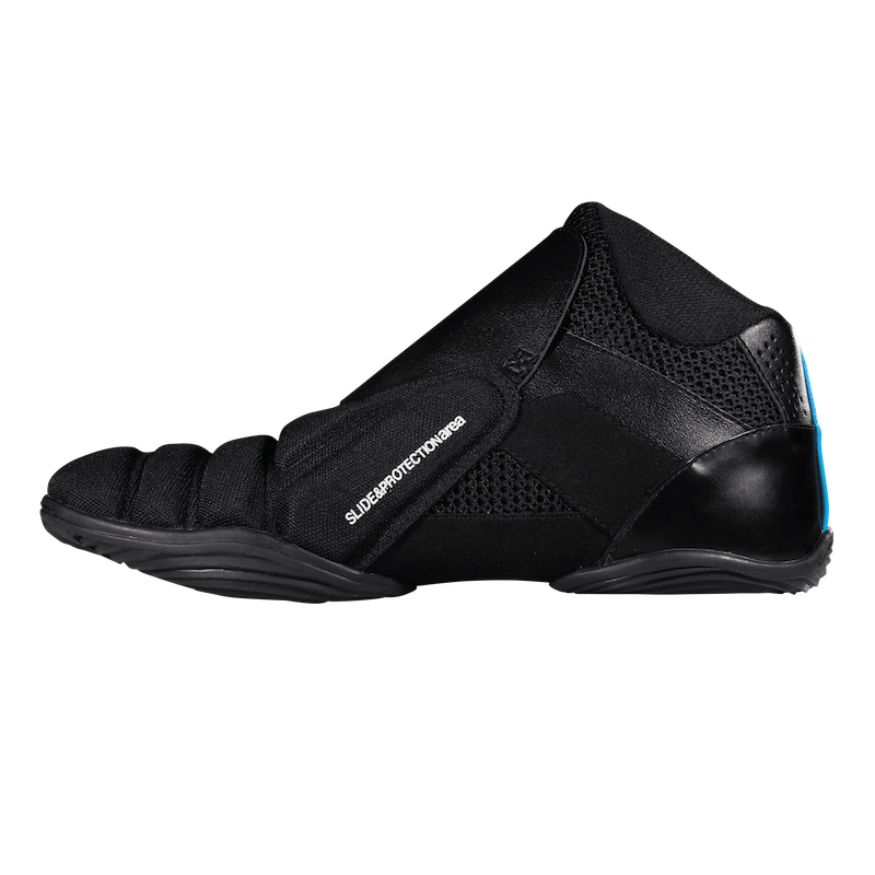 The world's first floorball goalie shoe, now available in an all-black colorway. The lightweight and flexible design of this shoe is perfect for agile floorball goalies who require excellent sliding capabilities on any indoor surface. The shoe's upper is constructed with special padding that is reinforced by a highly durable polyester fabric, ensuring maximum sliding performance. The outsole is divided into two units, allowing for optimal flexibility, while the asymmetrical lacing construction minimizes interference with the flex area. Additionally, the shoe features an exterior tongue that protects and secures the laces during gameplay. Experience unparalleled comfort and performance with the latest version of this legendary goalie shoe.