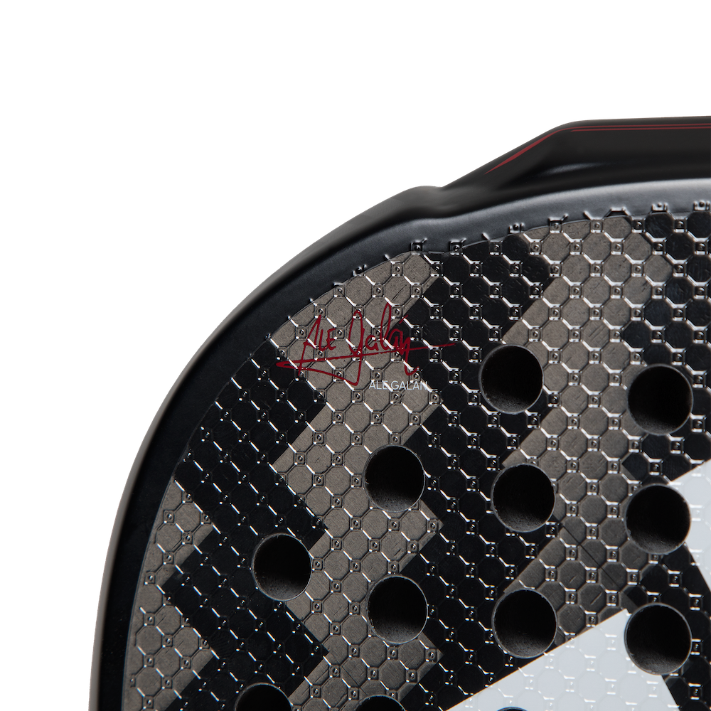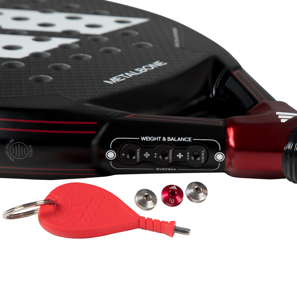A racket in which the power reaches exceptional levels for top level players. The METALBONE 3.3 is a power racket with all the features to meet the needs of PRO level players. It includes the Weight & Balance System, a technology that offers the possibility of modifying the weights and balance of the racket to obtain an even more powerful version or to enhance control. The best spin shots are guaranteed by the roughness of the Spin Blade Decal and the arrangement of the holes of the Smart Holes Curve. The racket has a highly rigid composition thanks to the Octagonal Structure in the frame of the racket and the Carbon Aluminized 2 to 1 fiber on the surface. The Diamond Oversize head shape is ideal for the most powerful shots. WEIGHT & BALANCE SYSTEM The capacity to gather different rackets in one single handle is possible thanks to this technology. The system of removable weights located in the neck allows the player to modify the balance and the total weight of the racket and adapt its. There are a total of six screws that can adapt the racket for an attack or control style, as desired by the player. OCTAGONAL STRUCTURE Maximum rigidity comes from the interior. This technology has a tubular structure with an octagonal section in the core of the racket that gives it great consistency. Its resistance to torsion is extremely high, so the most powerful shots are guaranteed. SPIN BLADE DECAL This technology covers the face of the racket with a rough surface with a high grip capacity. The friction with the ball is total, so the effects are carried out with astonishing ease.